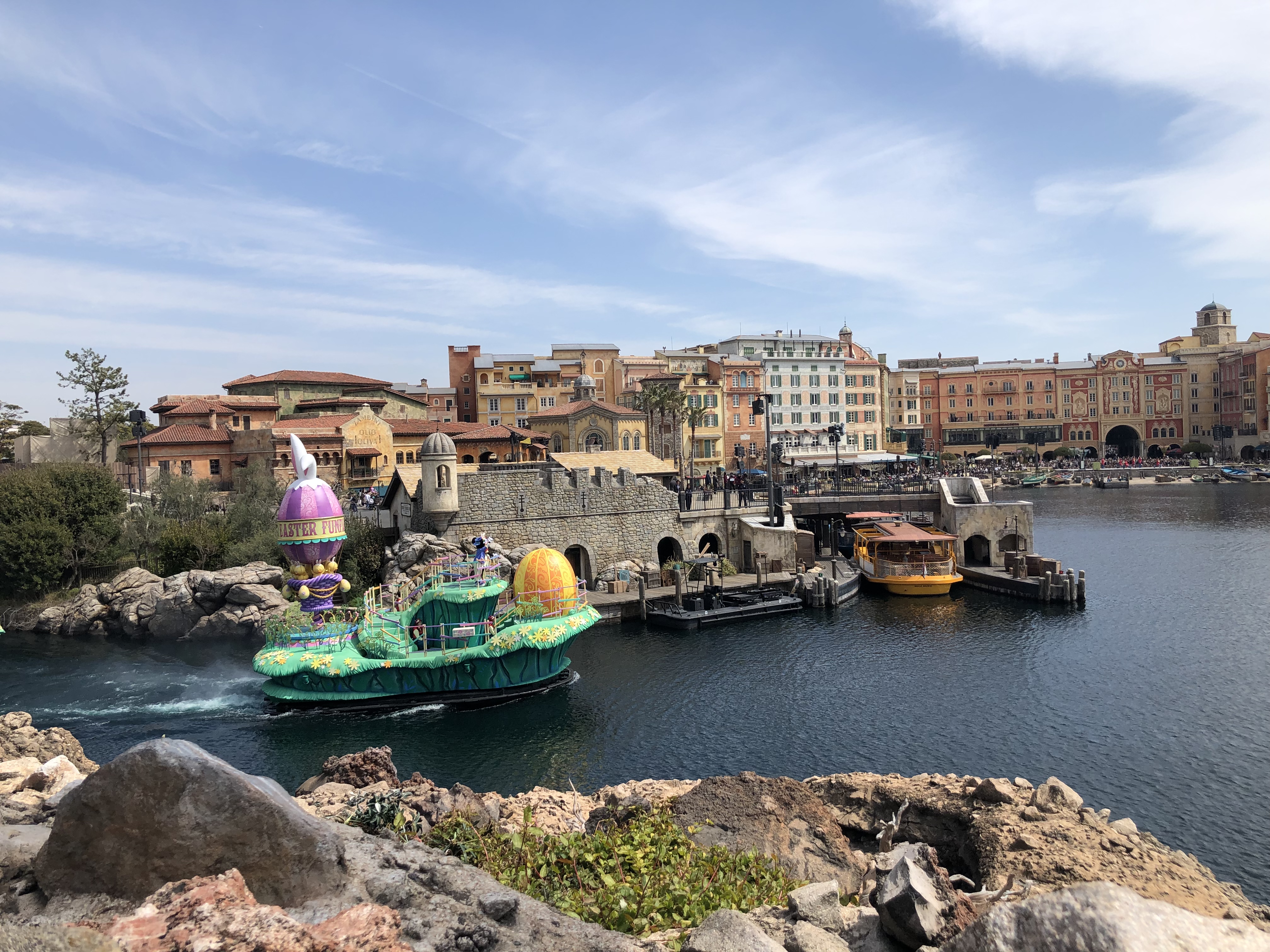 Next we waited in line for Aquatopia, our first trackless ride ever. That part was cool, but it wasn’t exactly the most thrilling ride we’ve ever been on. We caught a few minutes of the Easter show out in the harbor on our way to lunch.